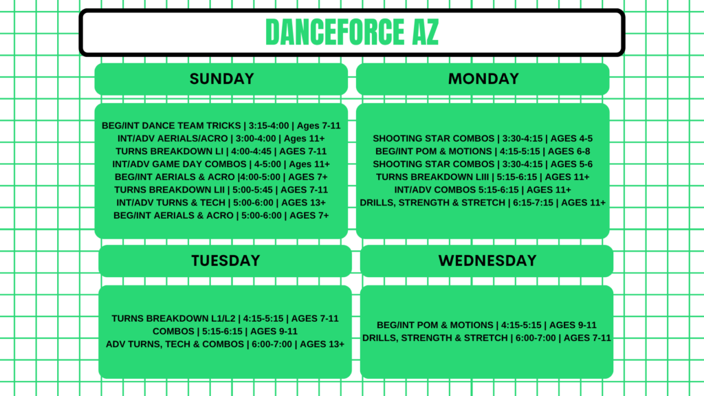 Our experienced and passionate instructors will guide you through a comprehensive range of exercises, drills, and combinations. Whether you’re a beginner or an advanced dancer, our training is tailored to meet your individual needs and goals. Join our weekly technique training sessions and take your dance team journey to the next level!